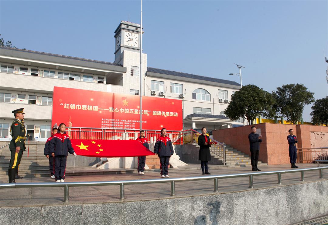 國旗傳遞交接儀式上,英雄航天員湯洪波手捧這面遨游太空、滿載祖國榮譽的五星紅旗,將其依次傳遞給湖南省少工委負責同志、優(yōu)秀少先隊輔導員代表、少先隊員代表。