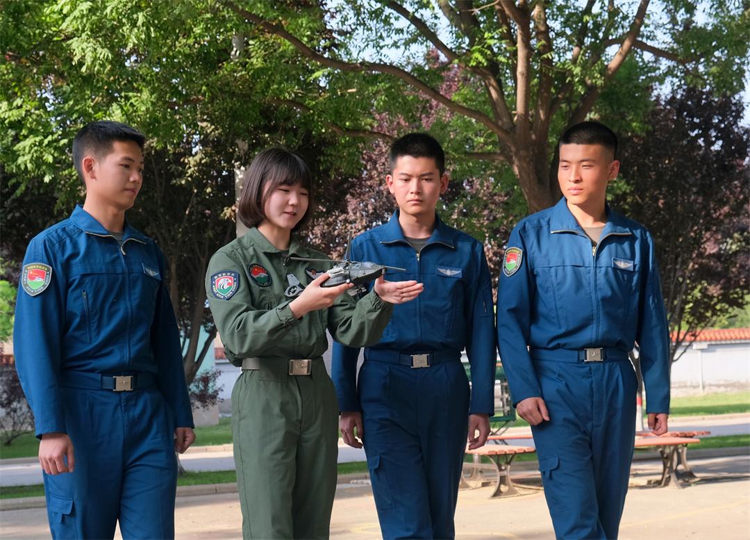 圖為女飛行教員劉玥瑋(左二)為男飛行學(xué)員講授飛行戰(zhàn)術(shù)動(dòng)作。