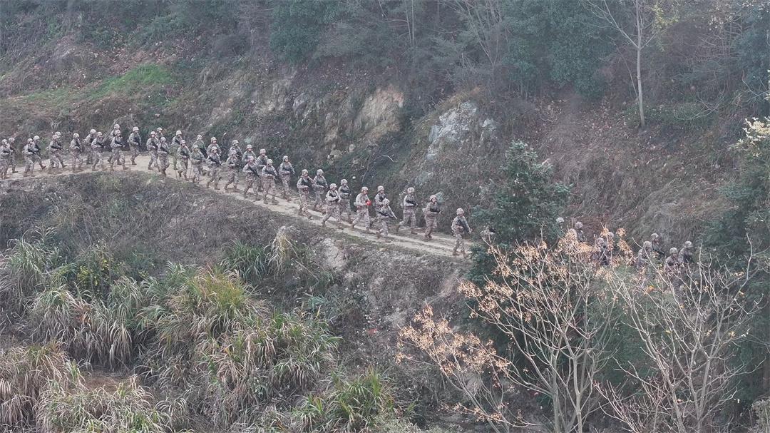 圖為參訓(xùn)官兵正在徒步行軍。