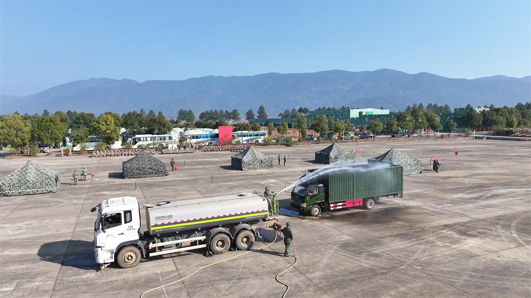 圖為參訓(xùn)官兵開(kāi)展人員和車(chē)輛防化洗消訓(xùn)練。
