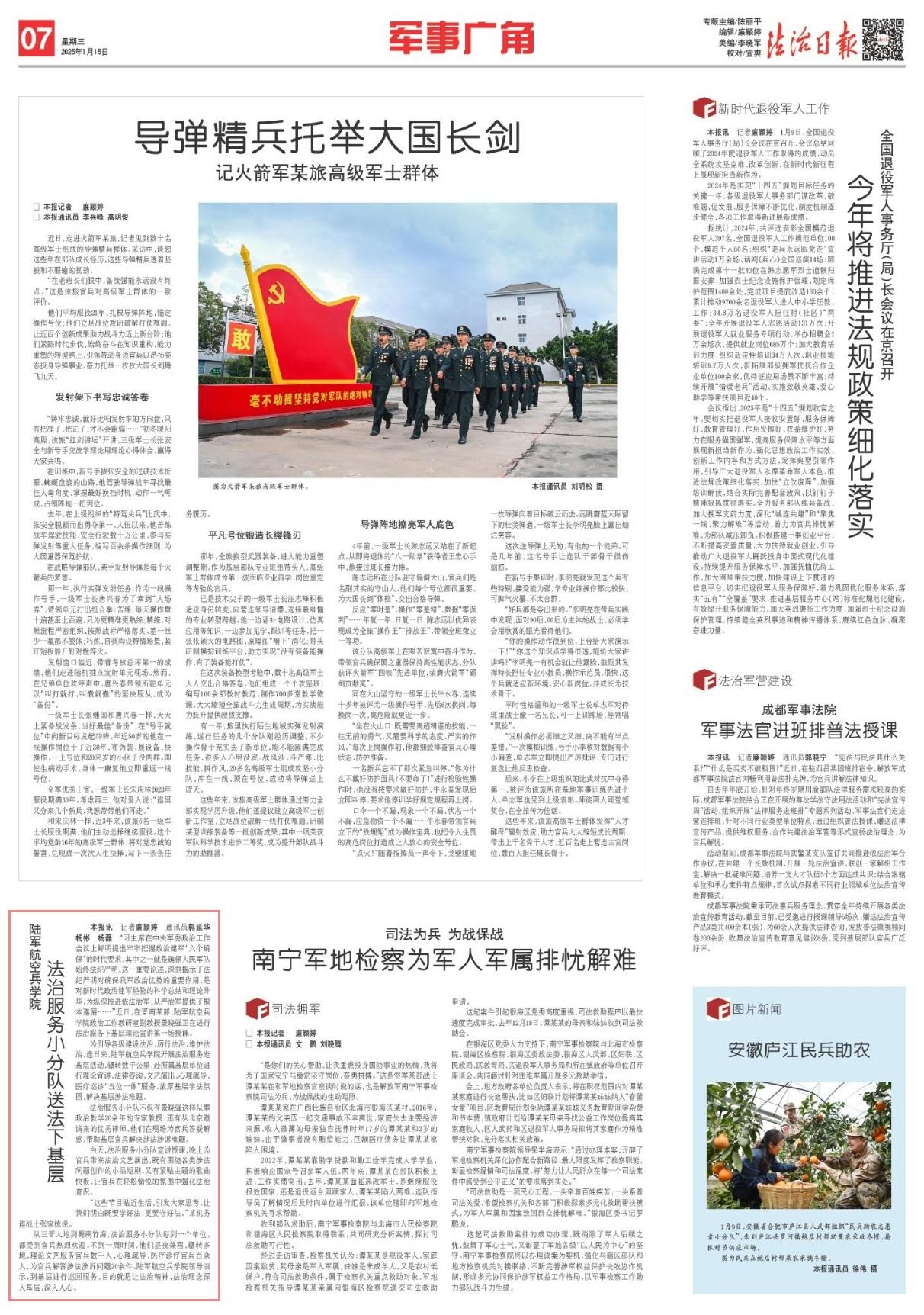 從三晉大地到蜀南竹海,法治服務(wù)小分隊每到一個單位,都受到官兵熱烈歡迎。不到一周時間,他們晝夜兼程、輾轉(zhuǎn)多地,理論文藝服務(wù)官兵數(shù)千人,心理疏導(dǎo)、醫(yī)療診療官兵百余人,為官兵解答涉法涉訴問題20余件。陸軍航空兵學(xué)院領(lǐng)導(dǎo)表示,到基層進行巡回服務(wù),目的就是讓法治精神、法治理念深入基層、深入人心。