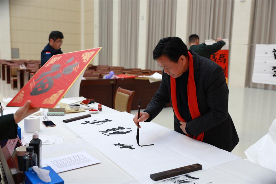 活動現(xiàn)場,書畫家們揮毫潑墨,將新春祝福和美好祝愿凝聚筆端,送到軍嫂軍娃和官兵代表手中,翰墨飄香中交織著歡聲笑語。壓紙、蘸墨、起筆、收筆,一起一落間,一張張蒼勁有力、筆走龍蛇的“?!弊周S然紙上,一幅幅濃墨重彩、寓意吉祥的“花開富貴”圖栩栩如生。禮堂里人頭攢動,大家簇擁在書法藝術家們身邊,看著他們的作品嘖嘖稱贊。