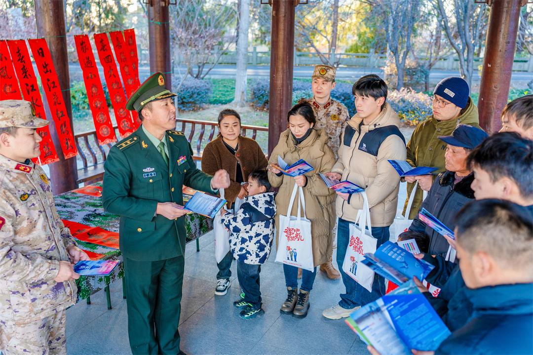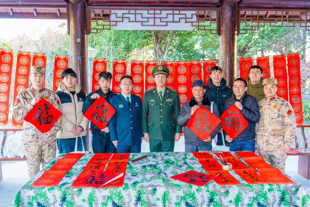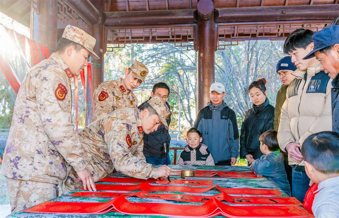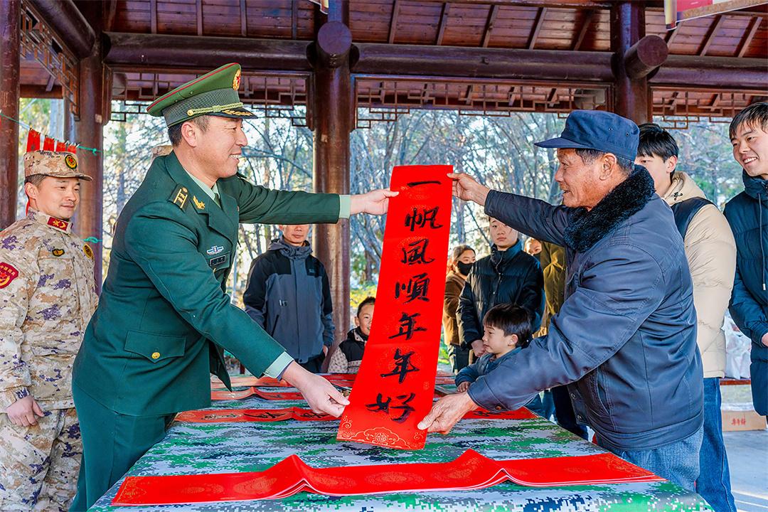1月15日,安徽省馬鞍山市博望區(qū)人武部組織現(xiàn)役官兵、文職人員、基干民兵走進(jìn)村鎮(zhèn)文化中心廣場,開展“寫春聯(lián)·送祝?!び麓骸蔽繂枌m?xiàng)活動(dòng)。圖為官兵給駐地群眾送上新春祝福。