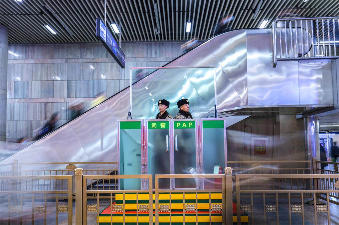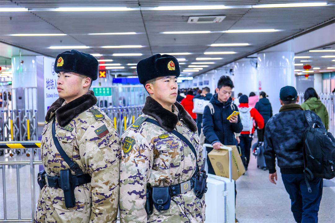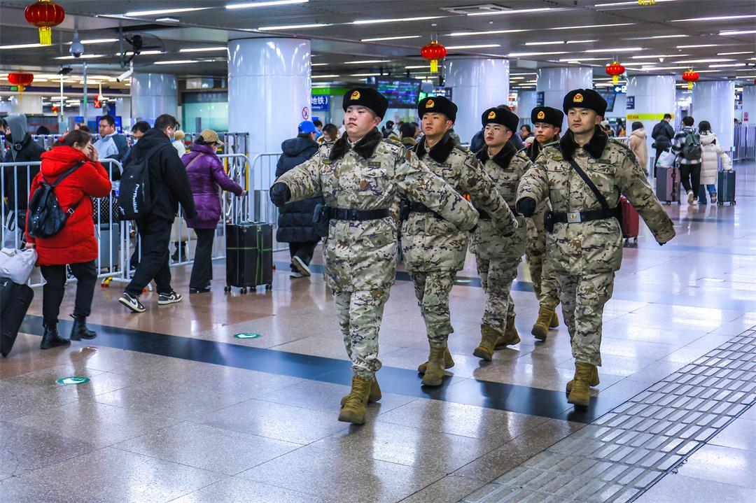 2月4日是春節(jié)假期最后一天,北京西站出發(fā)、到達(dá)雙向客流明顯增多。駐守北京西站的武警北京總隊(duì)執(zhí)勤第六支隊(duì)官兵針對客流明顯增多的情況,加強(qiáng)與重點(diǎn)站區(qū)管委會(huì)、屬地公安等部門聯(lián)防聯(lián)控,在進(jìn)出站口、地鐵站口等人員密集區(qū)域派出巡邏哨兵,加強(qiáng)現(xiàn)場偵察,協(xié)助維護(hù)秩序,確保遇有突發(fā)情況能夠迅速聯(lián)動(dòng)、有效處置,保證旅客安全順利返程。