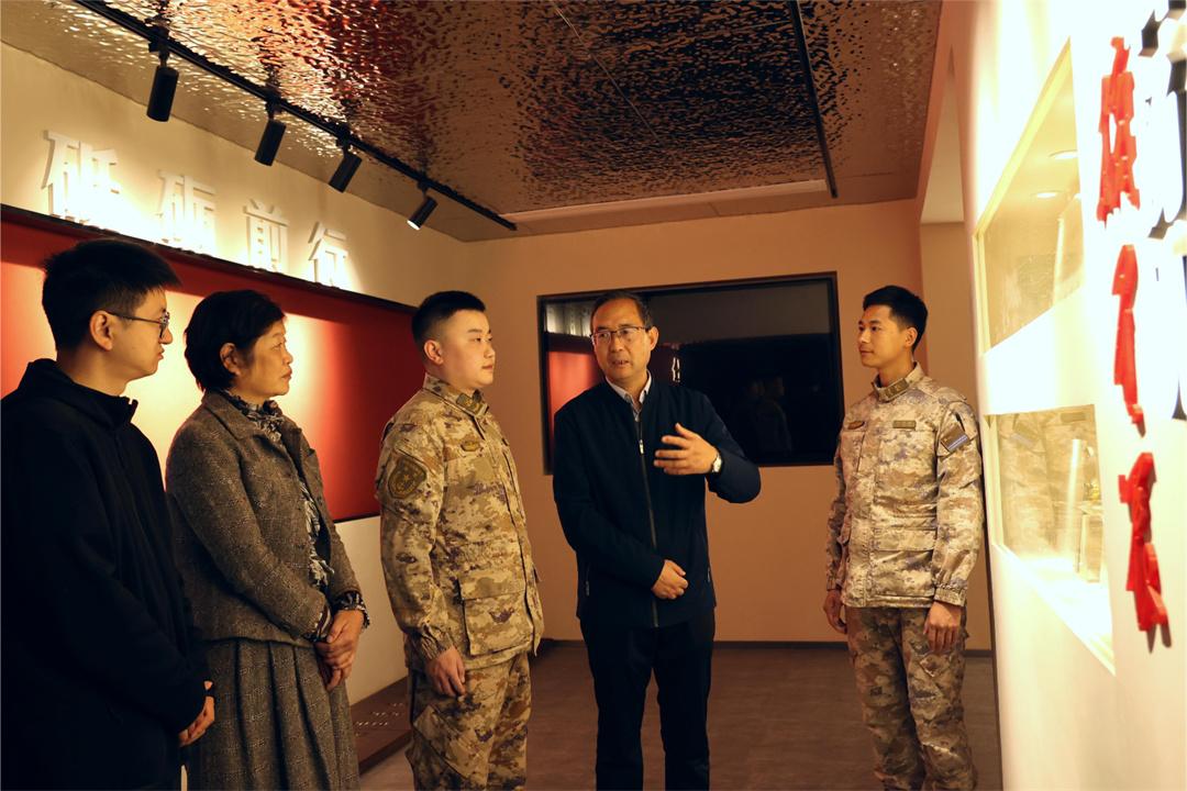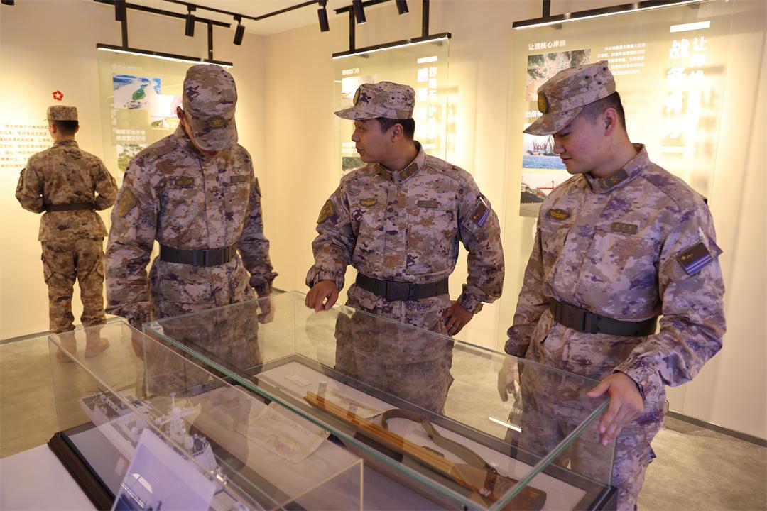 圖為全國(guó)愛(ài)國(guó)擁軍模范黃金國(guó)(右二)參觀大榭島雙擁展覽館。