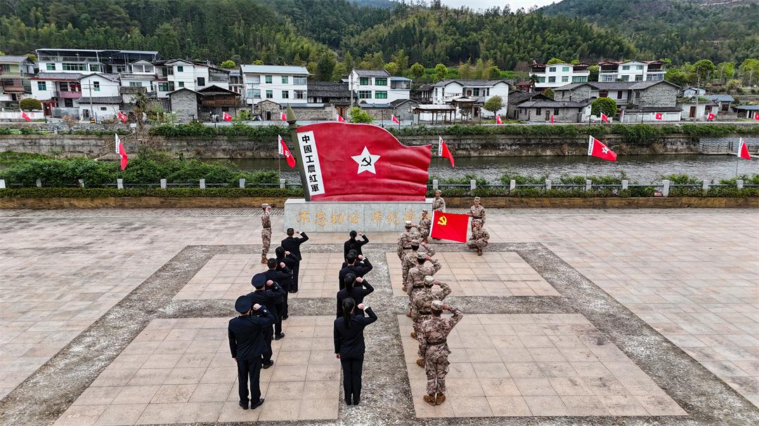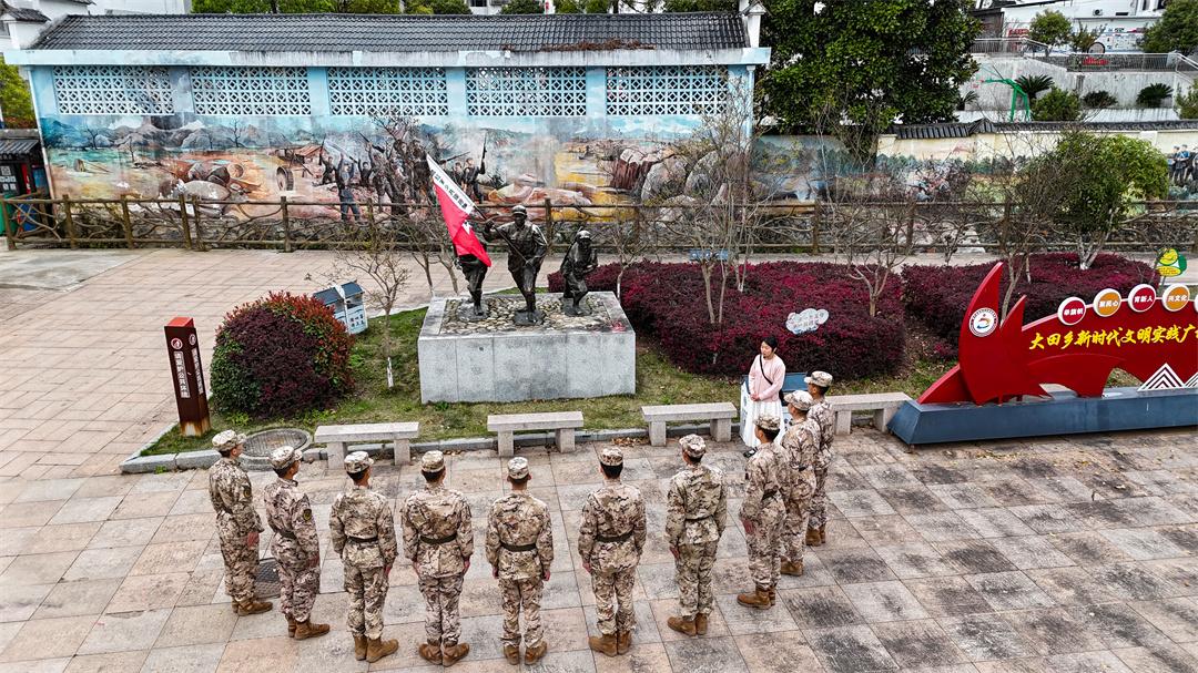 在大田鄉(xiāng)少年紅軍文化廣場(chǎng),中國(guó)工農(nóng)紅軍軍旗雕塑巍然矗立,黨員干部和官兵們整齊列隊(duì),重溫入黨誓詞。