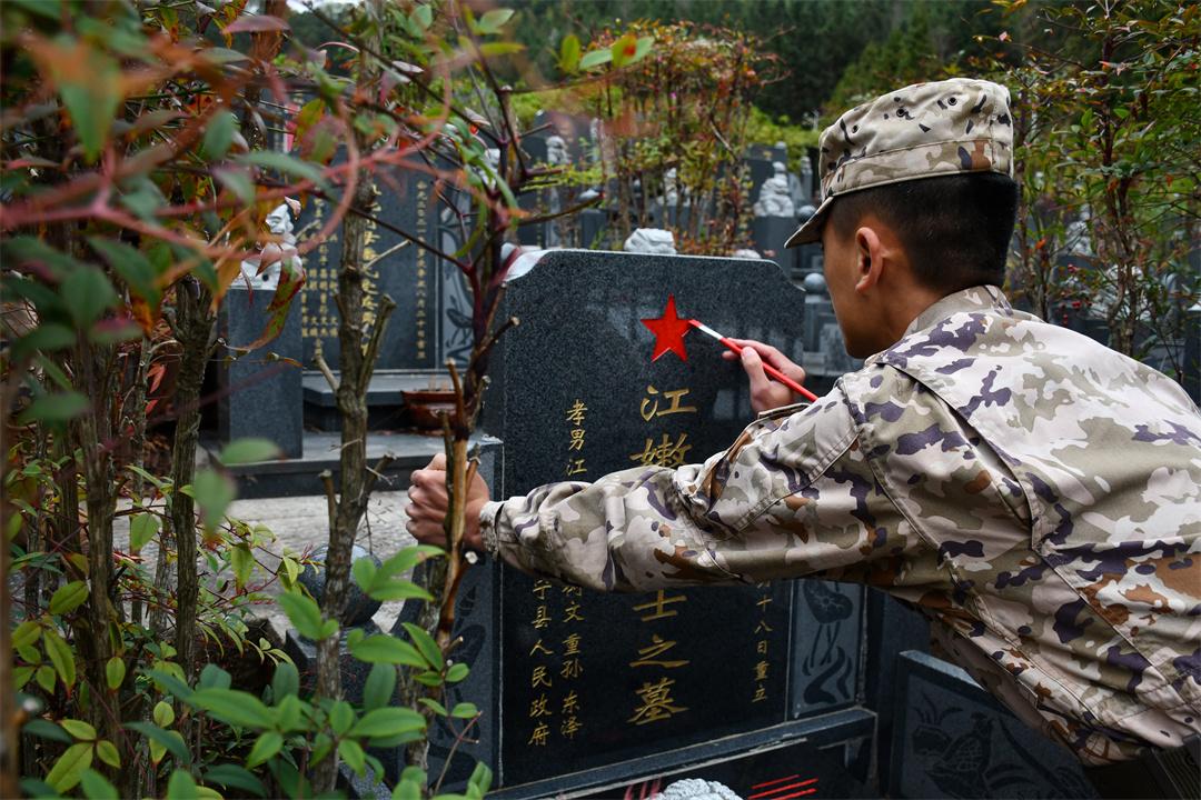 圖為官兵為烈士墓碑描紅。張顯超 攝