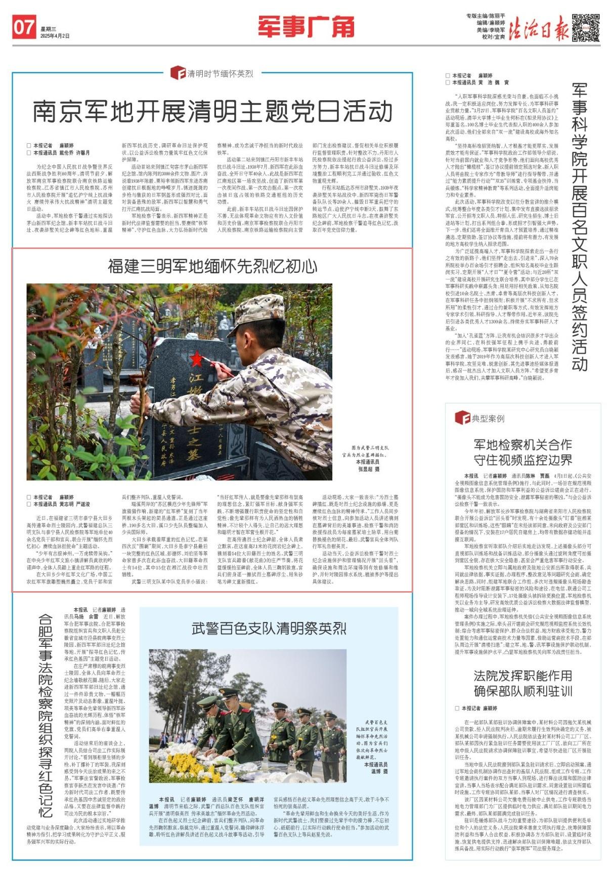 近日,在福建省三明市泰寧縣大田鄉(xiāng)高傳遴革命烈士陵園內(nèi),武警福建總隊(duì)三明支隊(duì)與泰寧縣人民檢察院等軍地單位40余名黨員干部和官兵,聯(lián)合開(kāi)展“緬懷先烈憶初心 賡續(xù)血脈擔(dān)使命”主題活動(dòng)。
