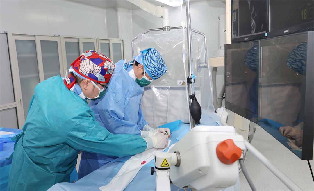 早一秒手術(shù)就多一絲康復(fù)希望。劉愛軍馬上抽組科室精干力量組成專家救治小組,實(shí)施導(dǎo)管介入取栓手術(shù)。醫(yī)護(hù)人員從右側(cè)大腿腹股溝股動(dòng)脈處建立通路,在支架輔助下,取栓導(dǎo)管安全精準(zhǔn)抵達(dá)堵塞血管處。不多久,在劉愛軍團(tuán)隊(duì)細(xì)心操作下,比頭發(fā)還細(xì)的導(dǎo)絲成功穿過血栓,并引領(lǐng)支架成功取出血栓。