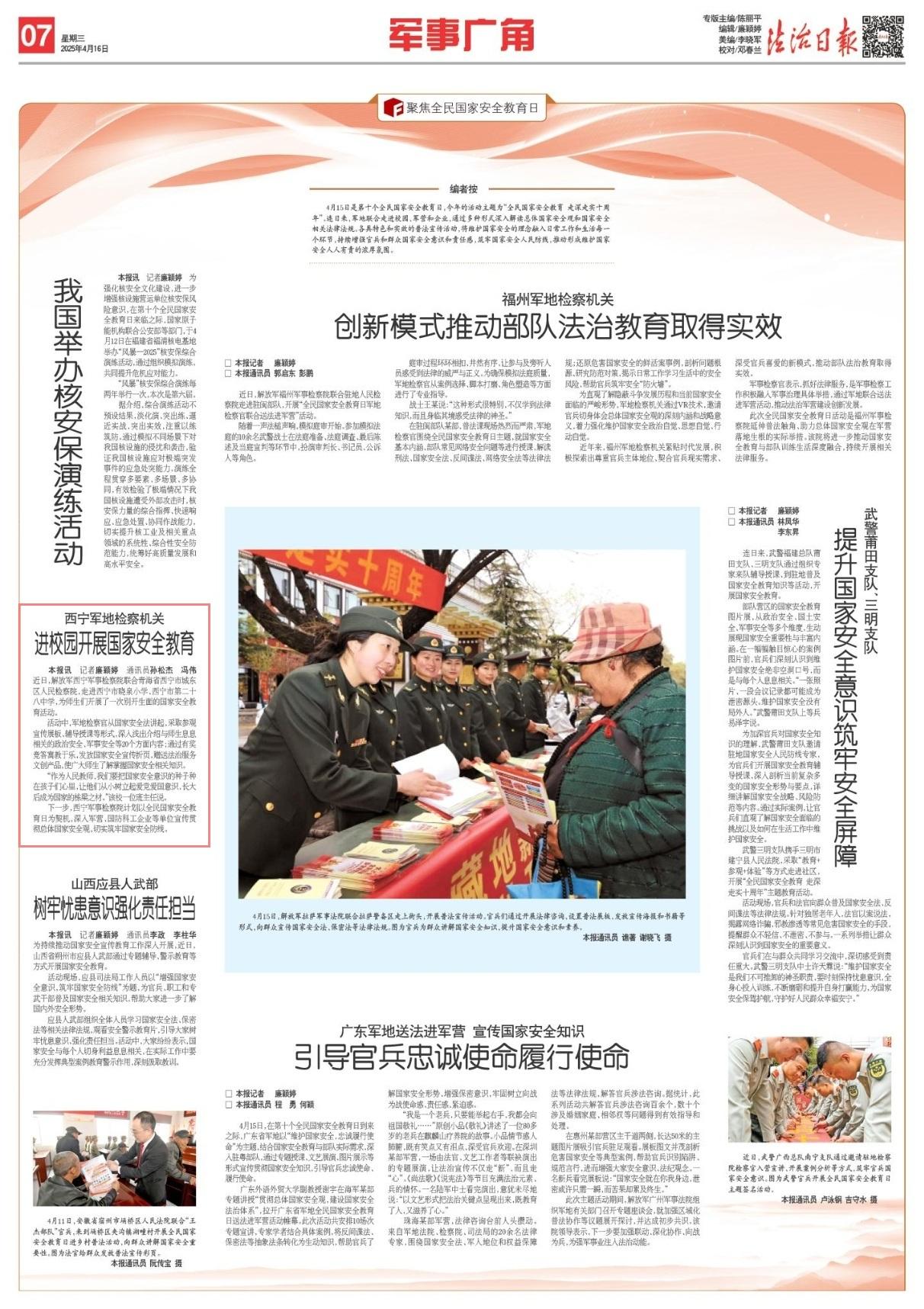 下一步,西寧軍事檢察院計劃以全民國家安全教育日為契機(jī),深入軍營、國防科工企業(yè)等單位宣傳貫徹總體國家安全觀,切實(shí)筑牢國家安全防線。