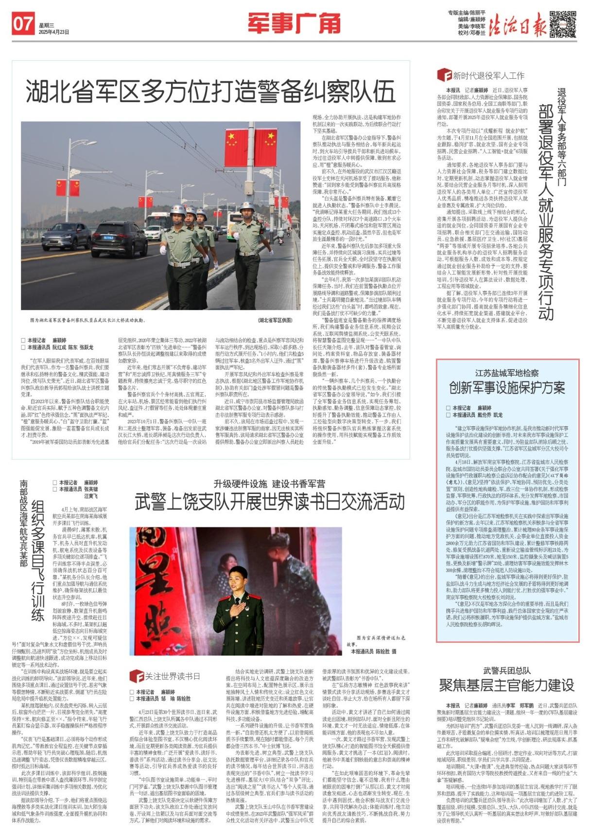 4月18日,解放軍南京軍事檢察院、江蘇省鹽城市人民檢察院、鹽城市國(guó)防動(dòng)員委員會(huì)聯(lián)合辦公室共同簽署《關(guān)于強(qiáng)化軍事設(shè)施保護(hù)行政履職與檢察公益訴訟協(xié)作配合的意見》(以下簡(jiǎn)稱《意見》),《意見》堅(jiān)持“依法保護(hù)、軍地協(xié)同、預(yù)防優(yōu)先、分類處置”原則,創(chuàng)造性地構(gòu)建檢、軍、政三位一體協(xié)作機(jī)制,形成檢察監(jiān)督、軍事統(tǒng)籌、行政執(zhí)法的閉環(huán)體系,充分發(fā)揮軍地檢察、市國(guó)動(dòng)辦、軍分區(qū)的職能作用,為保護(hù)軍事設(shè)施,維護(hù)國(guó)防和軍事利益提供有益探索。