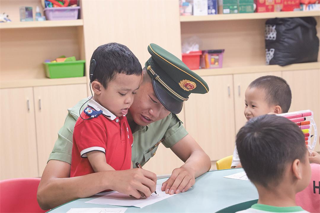 圖為“紅色前哨連”官兵與聾啞兒童互動(dòng)教學(xué)。