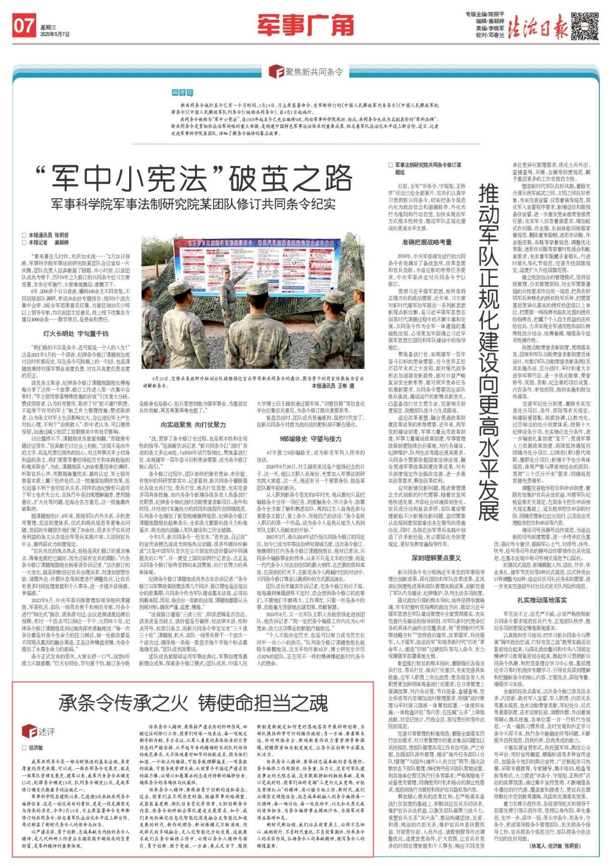 軍事科學院自建院以來,已連續(xù)9次承擔共同條令編修任務。這是一份沉甸甸的責任,更是一段充滿榮光與傳承的歷史。今年2月14日,習主席簽署命令發(fā)布新修訂的共同條令,標志著軍隊法治化水平邁上新臺階,再次彰顯了新時代條令人的使命與擔當。