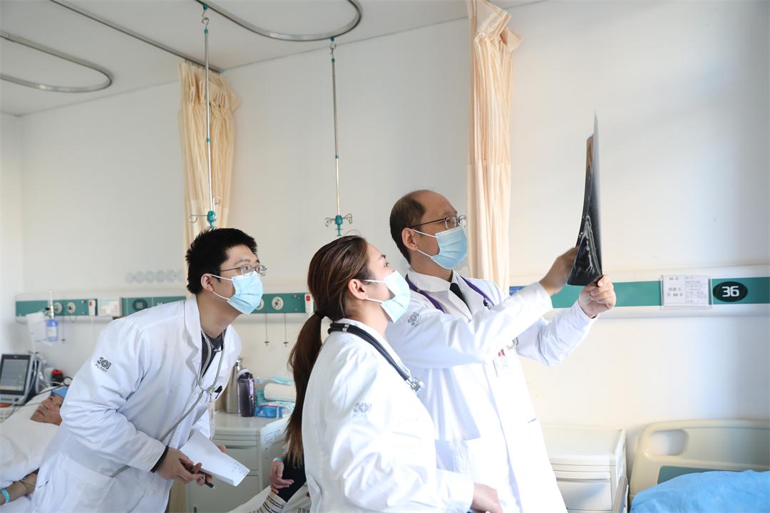 圖為胸外科主任宋偉安帶領(lǐng)團(tuán)隊(duì)研究胸部CT和病情資料。