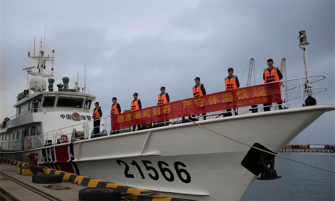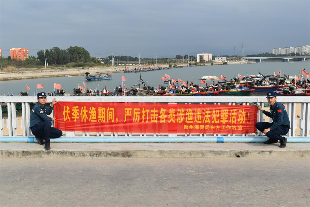 圖為執(zhí)法員懸掛伏季休漁橫幅標(biāo)語(yǔ)。