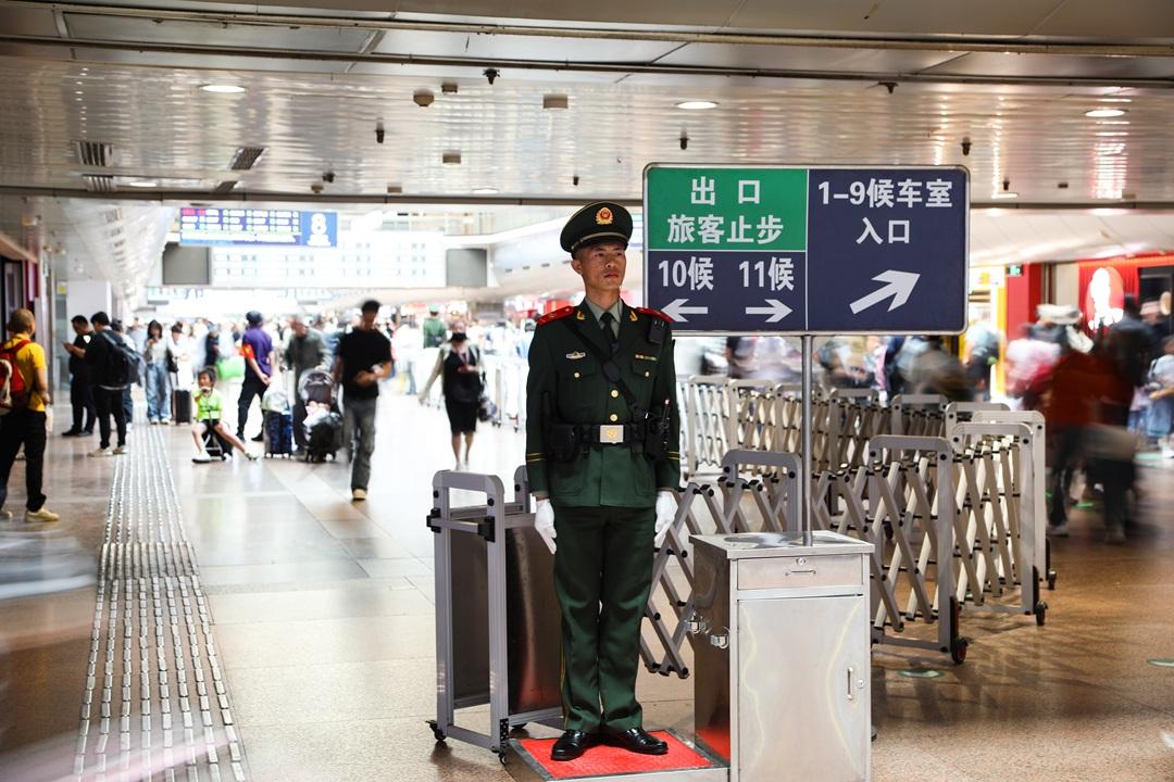 “五一期間,我們優(yōu)化勤務(wù)部署、科學(xué)籌措兵力,分別在安檢口、檢票口、候車區(qū)等重點部位布設(shè)多個哨位,在維護(hù)秩序的同時提供便民服務(wù),確保旅客出行安全順暢?!痹撝ш犇持嘘犞嘘犻L曹懷源說。