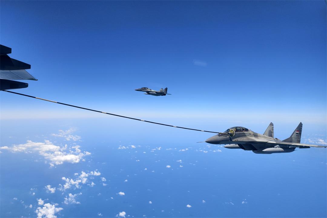 圖為4月28日,參加中?!拔拿髦?2025”空軍聯(lián)合訓練的中國空軍運油-20飛機和埃及空軍米格-29飛機進行空中加油訓練。余紅春 攝