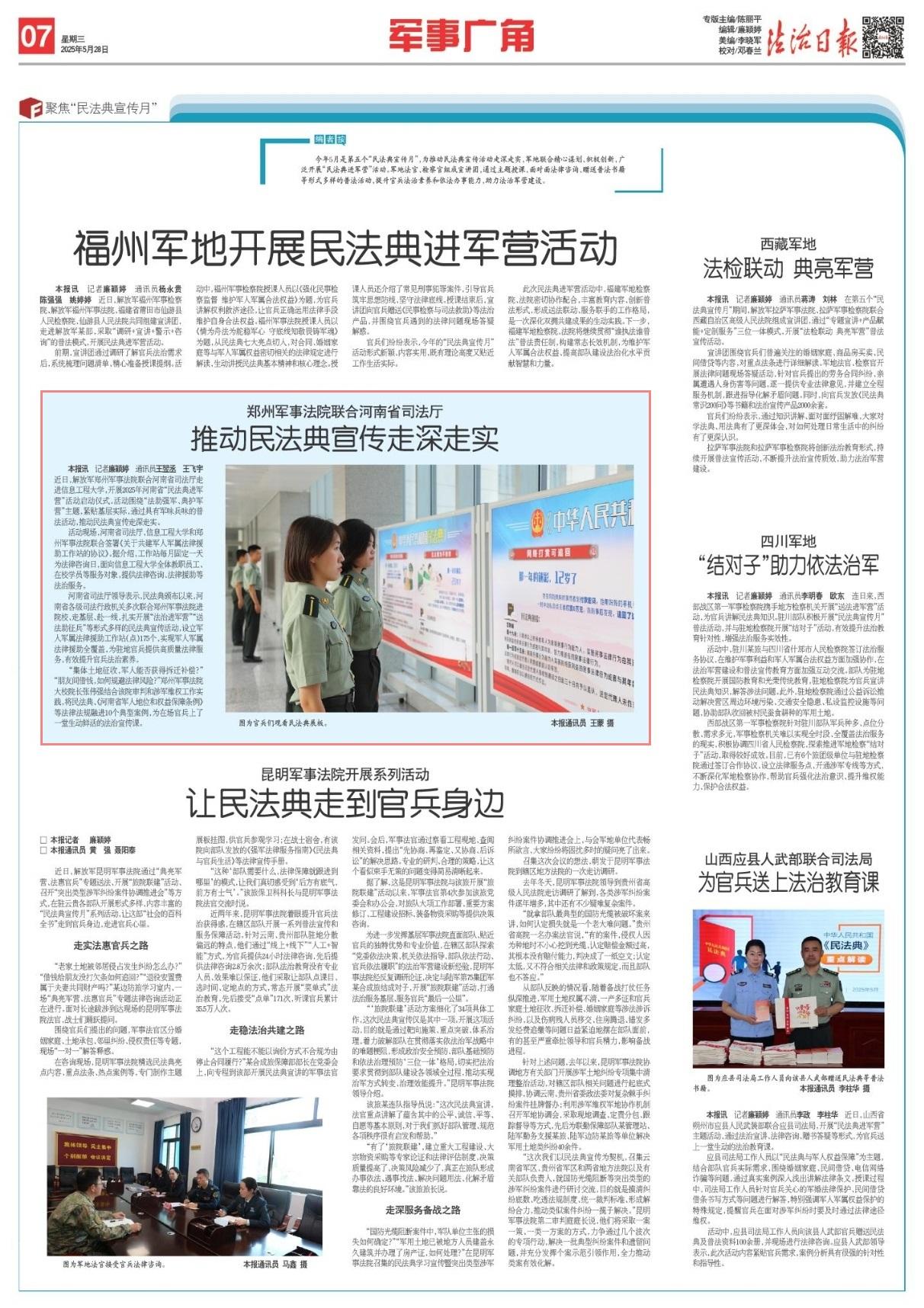 河南省司法廳領(lǐng)導(dǎo)表示,民法典頒布以來(lái),河南省各級(jí)司法行政機(jī)關(guān)多次聯(lián)合鄭州軍事法院進(jìn)院校、走基層、赴一線,扎實(shí)開展“法治進(jìn)軍營(yíng)”“送法助征兵”等形式多樣的民法典宣傳活動(dòng),設(shè)立軍人軍屬法律援助工作站(點(diǎn))175個(gè),實(shí)現(xiàn)軍人軍屬法律援助全覆蓋,為駐地官兵提供高質(zhì)量法律服務(wù),有效提升官兵法治素養(yǎng)。