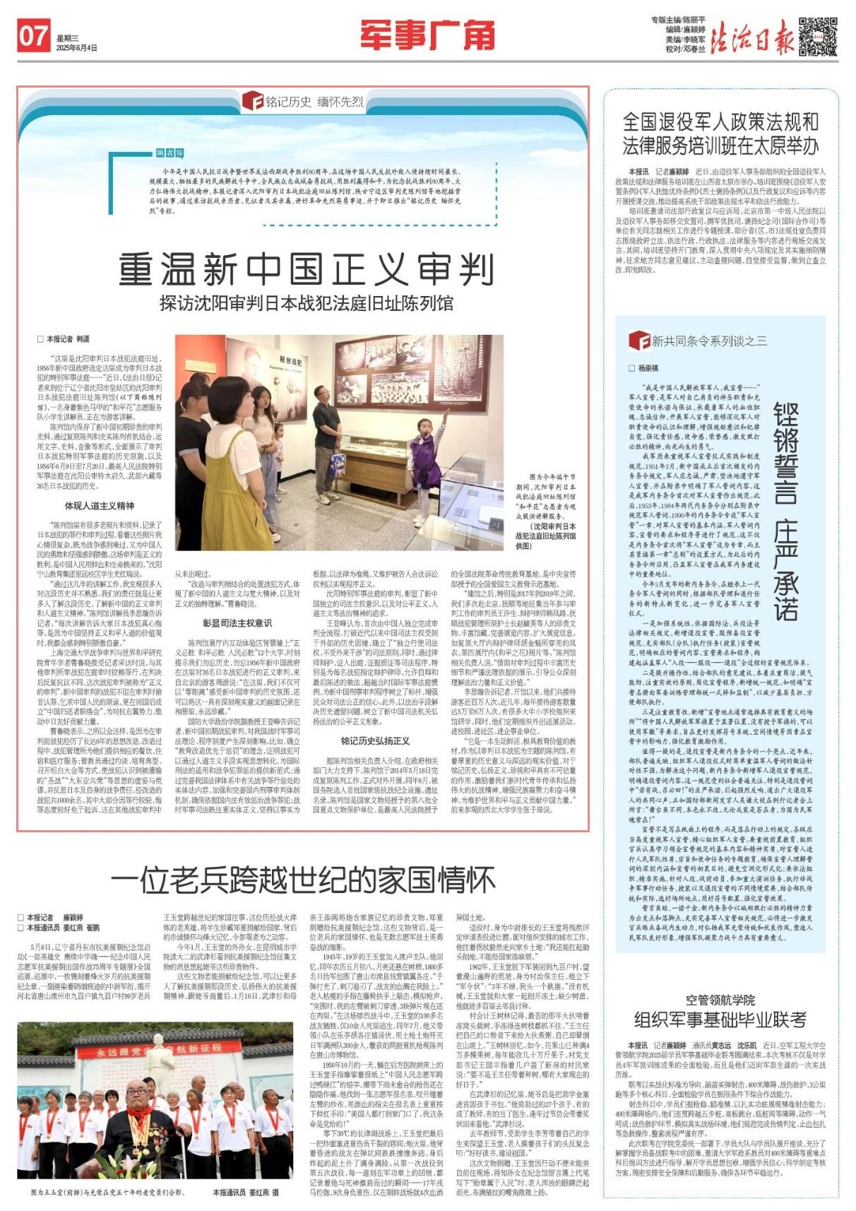 今年是中國人民抗日戰(zhàn)爭暨世界反法西斯戰(zhàn)爭勝利80周年。在這場中國人民反抗外敵入侵持續(xù)時間最長、規(guī)模最大、犧牲最多的民族解放斗爭中,全民族眾志成城奮勇抗戰(zhàn),用勝利贏得和平。為紀(jì)念抗戰(zhàn)勝利80周年,大力弘揚(yáng)偉大抗戰(zhàn)精神,本報記者深入沈陽審判日本戰(zhàn)犯法庭舊址陳列館、陜甘寧邊區(qū)審判史陳列館等地挖掘背后的故事,通過采訪抗戰(zhàn)親歷者、見證者及其親屬,講好革命先烈英勇事跡,并于即日推出“銘記歷史 緬懷先烈”專欄。