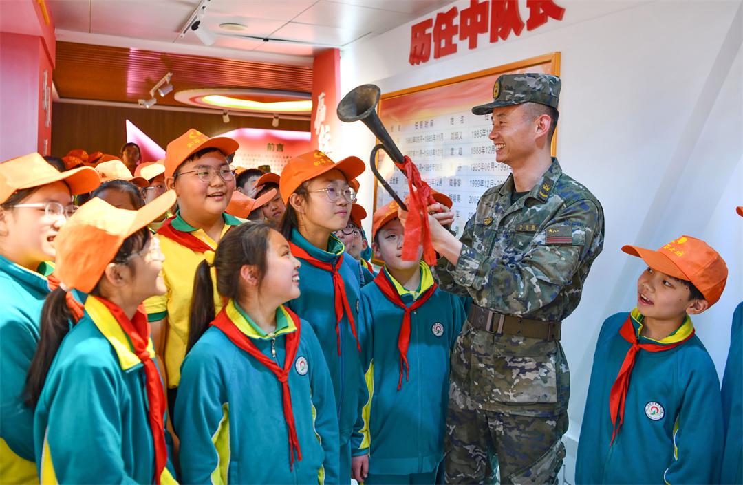 圖為在軍營開放日活動中,中隊戰(zhàn)士向學生講述老軍號的故事。徐偉 攝