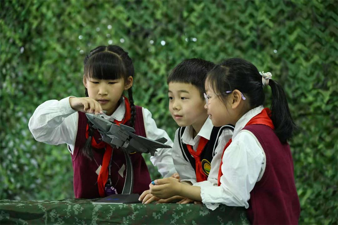 圖為孩子們在觀看裝備模型。