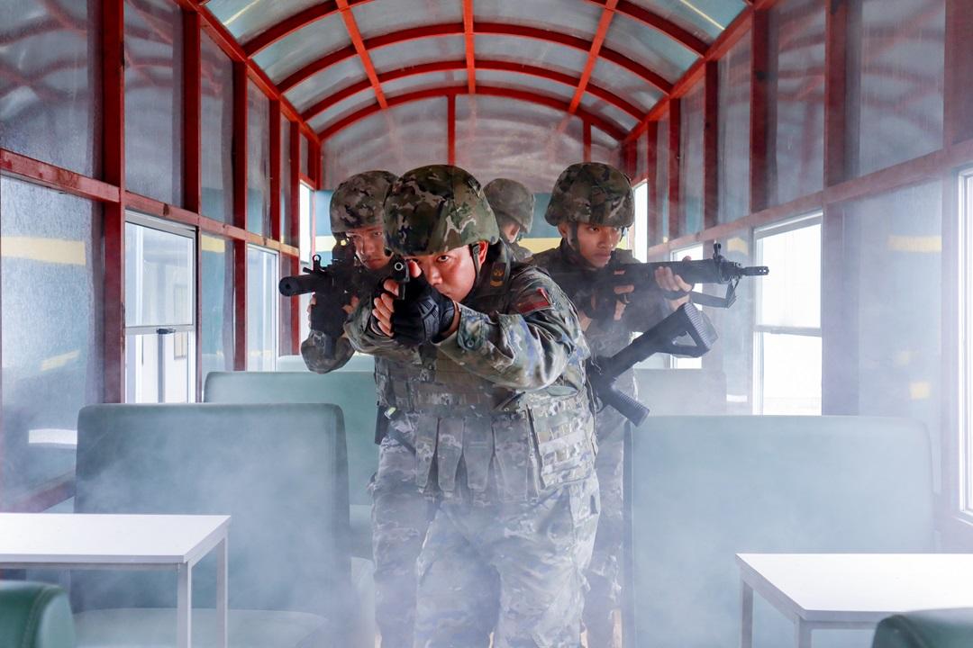 圖為李興坤帶領(lǐng)小組進(jìn)行火車反劫持演練。