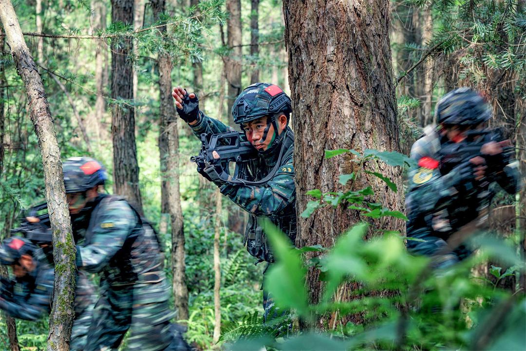 圖為李興坤(中)帶領(lǐng)小隊(duì)進(jìn)行山林地捕殲戰(zhàn)斗演練。