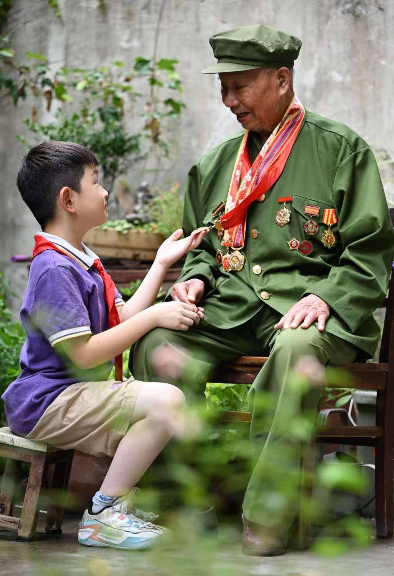 圖為孩子們走進(jìn)老兵家中,聆聽(tīng)?wèi)?zhàn)斗故事。