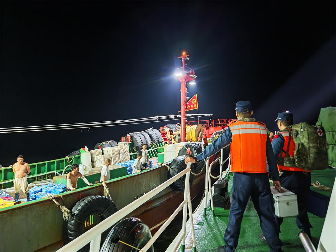 由于夜間航行,海上能見度較差,且事發(fā)海域周邊漁網(wǎng)較多,給航行帶來較大困難,永隆艦執(zhí)法員們憑借出色的駕駛技能和豐富夜航經(jīng)驗,克服諸多不利因素,穩(wěn)慎駕駛艦艇趕往事發(fā)海域。航行中,執(zhí)法員們通過多種通信方式與求助漁船保持聯(lián)系,動態(tài)掌握船舶位置及傷員情況,隨艦醫(yī)護人員遠程指導漁船其他人員為傷者開展先期輔助治療。