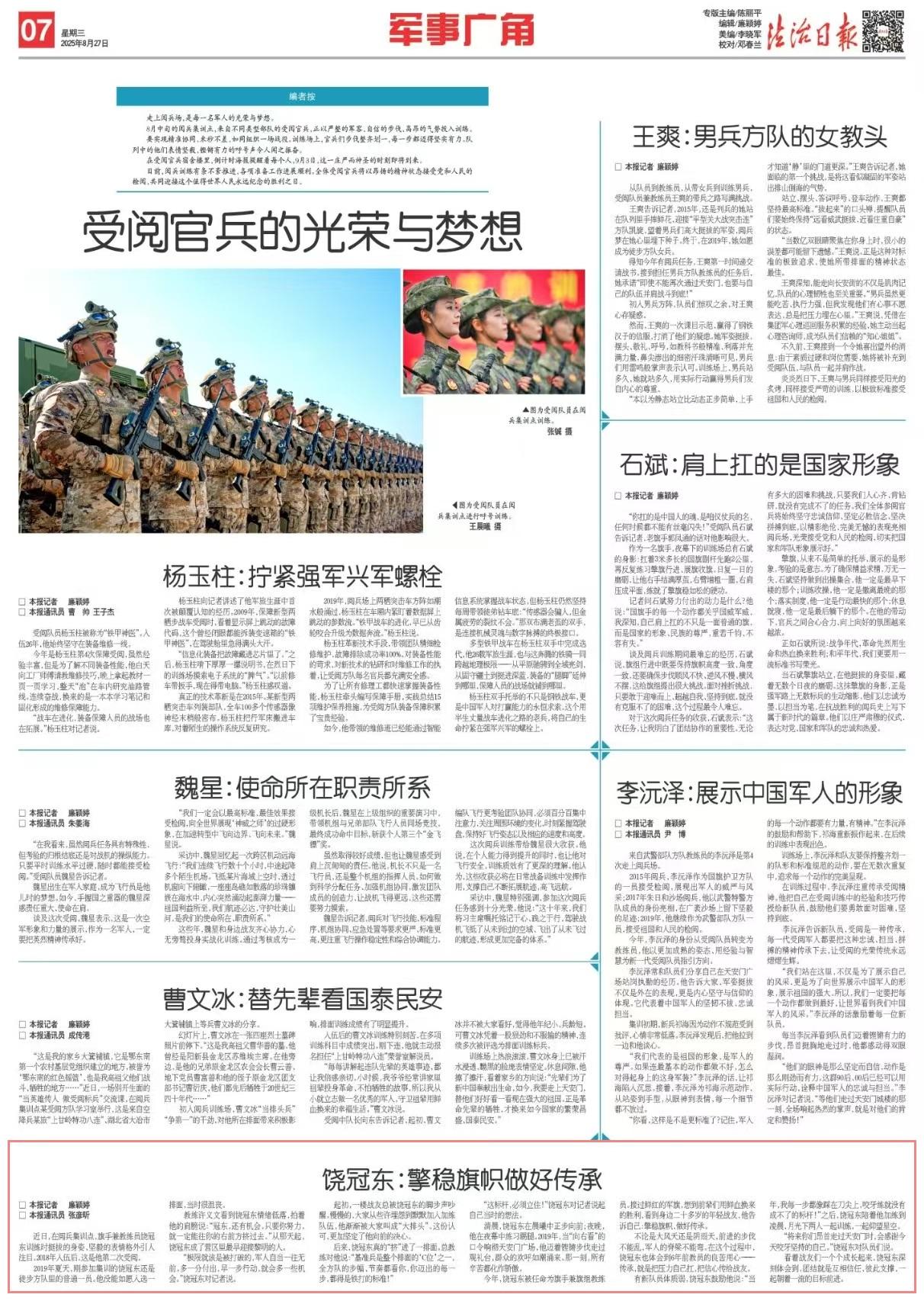 今年,饒冠東被任命為旗手兼旗組教練員。接過鮮紅的軍旗,想到前輩們用鮮血換來的勝利,看到身邊二十多歲的年輕戰(zhàn)友,他告訴自己:擎穩(wěn)旗幟,做好傳承。