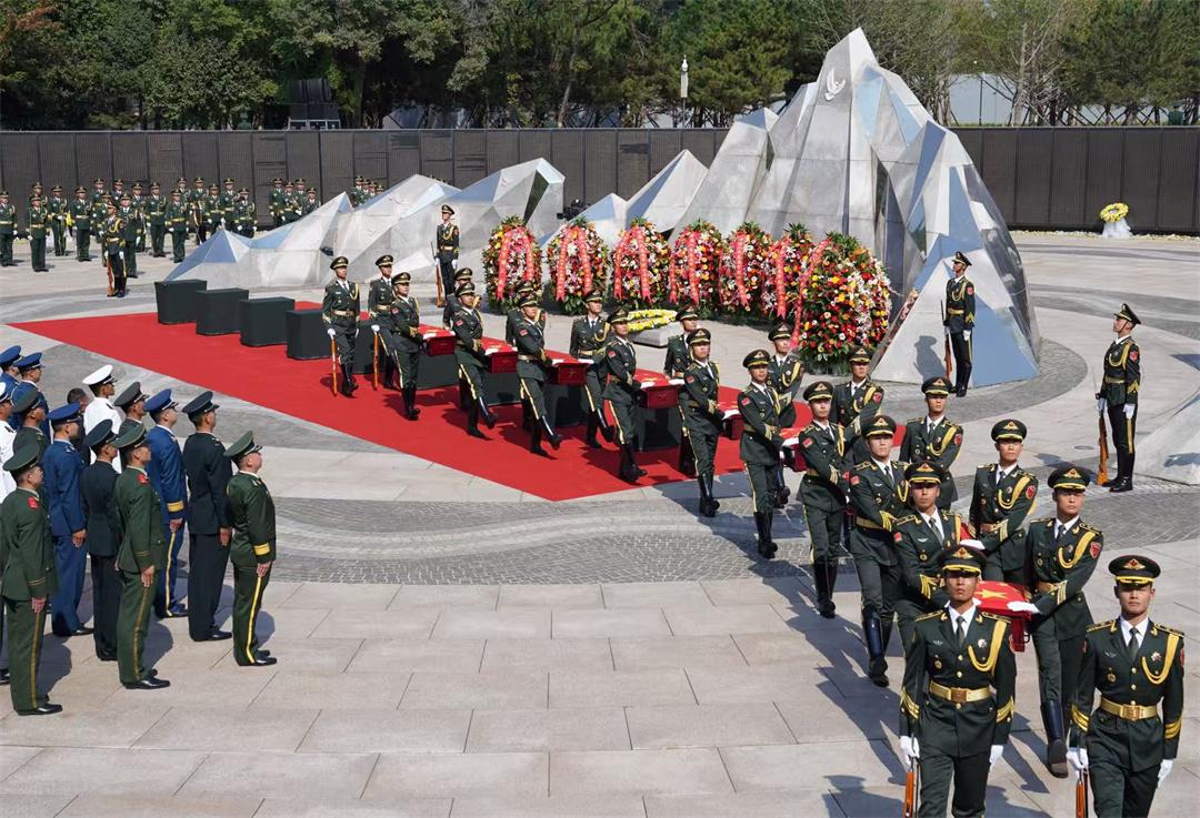 “中國人民志愿軍烈士永垂不朽!”退役軍人事務(wù)部黨組書記、部長裴金佳出席儀式并致祭文。全體人員向志愿軍烈士遺骸三鞠躬,27名禮兵連續(xù)鳴槍12響,向志愿軍烈士致以崇高敬意。