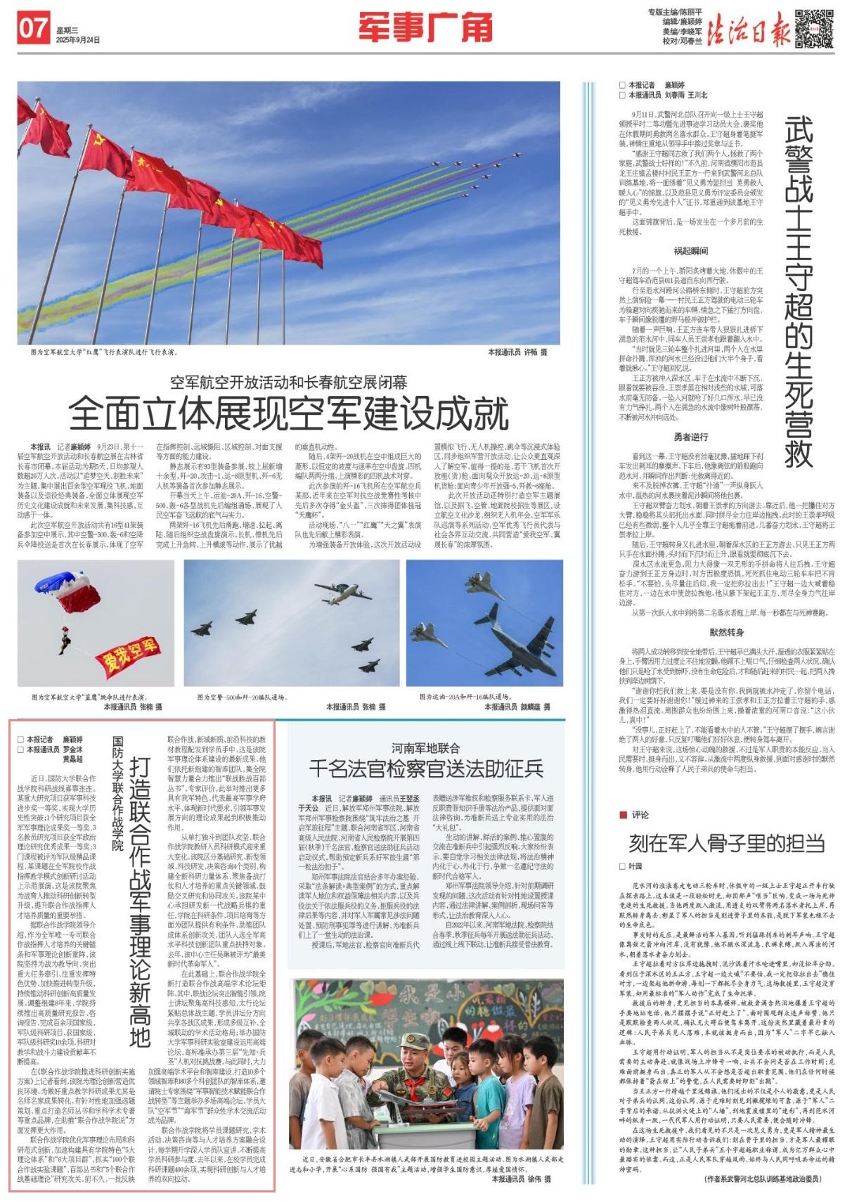 聯(lián)合作戰(zhàn)學(xué)院優(yōu)化軍事理論布局和科研范式創(chuàng)新,加速構(gòu)建具有學(xué)院特色“5大理論體系”和“6大項(xiàng)目群”,抓實(shí)“100個(gè)聯(lián)合作戰(zhàn)實(shí)驗(yàn)課題”、百部叢書和“5個(gè)聯(lián)合作戰(zhàn)基礎(chǔ)理論”研究攻關(guān)。前不久,一批反映聯(lián)合作戰(zhàn)、新域新質(zhì)、前沿科技的教材教程配發(fā)到學(xué)員手中,這是該院軍事理論體系建設(shè)的最新成果。他們依托新組建的智庫(kù)團(tuán)隊(duì),集全院智慧力量合力推出“聯(lián)戰(zhàn)勝戰(zhàn)百部叢書”。專家評(píng)價(jià),此舉對(duì)推出更多具有我軍特色、代表最高軍事學(xué)府水平、體現(xiàn)新時(shí)代要求、引領(lǐng)軍事發(fā)展方向的理論成果起到積極推動(dòng)作用。