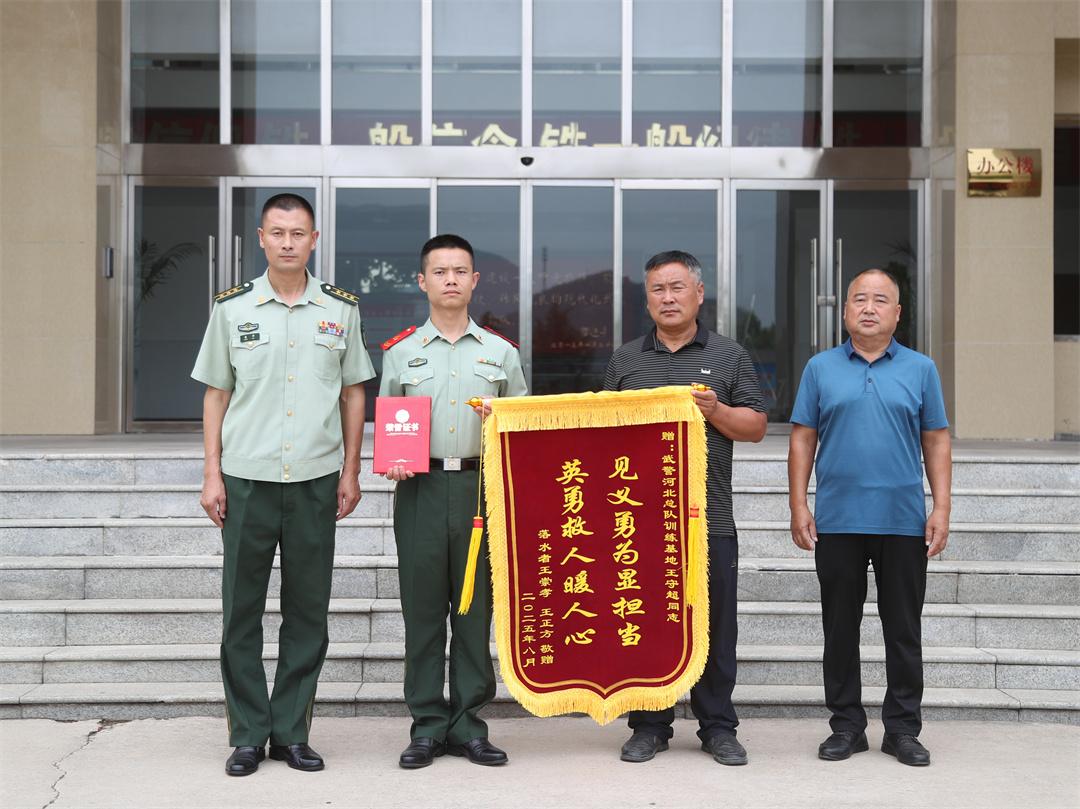 “感謝王守超同志救了我們兩個(gè)人,拯救了兩個(gè)家庭,武警戰(zhàn)士好樣的!”不久前,河南省濮陽(yáng)市范縣龍王莊鎮(zhèn)孟樓村村民王正方一行來(lái)到武警河北總隊(duì)訓(xùn)練基地,將一面繡著“見(jiàn)義勇為顯擔(dān)當(dāng) 英勇救人暖人心”的錦旗,以及范縣見(jiàn)義勇為評(píng)定委員會(huì)頒發(fā)的“見(jiàn)義勇為先進(jìn)個(gè)人”證書(shū),鄭重遞到該基地王守超手中。