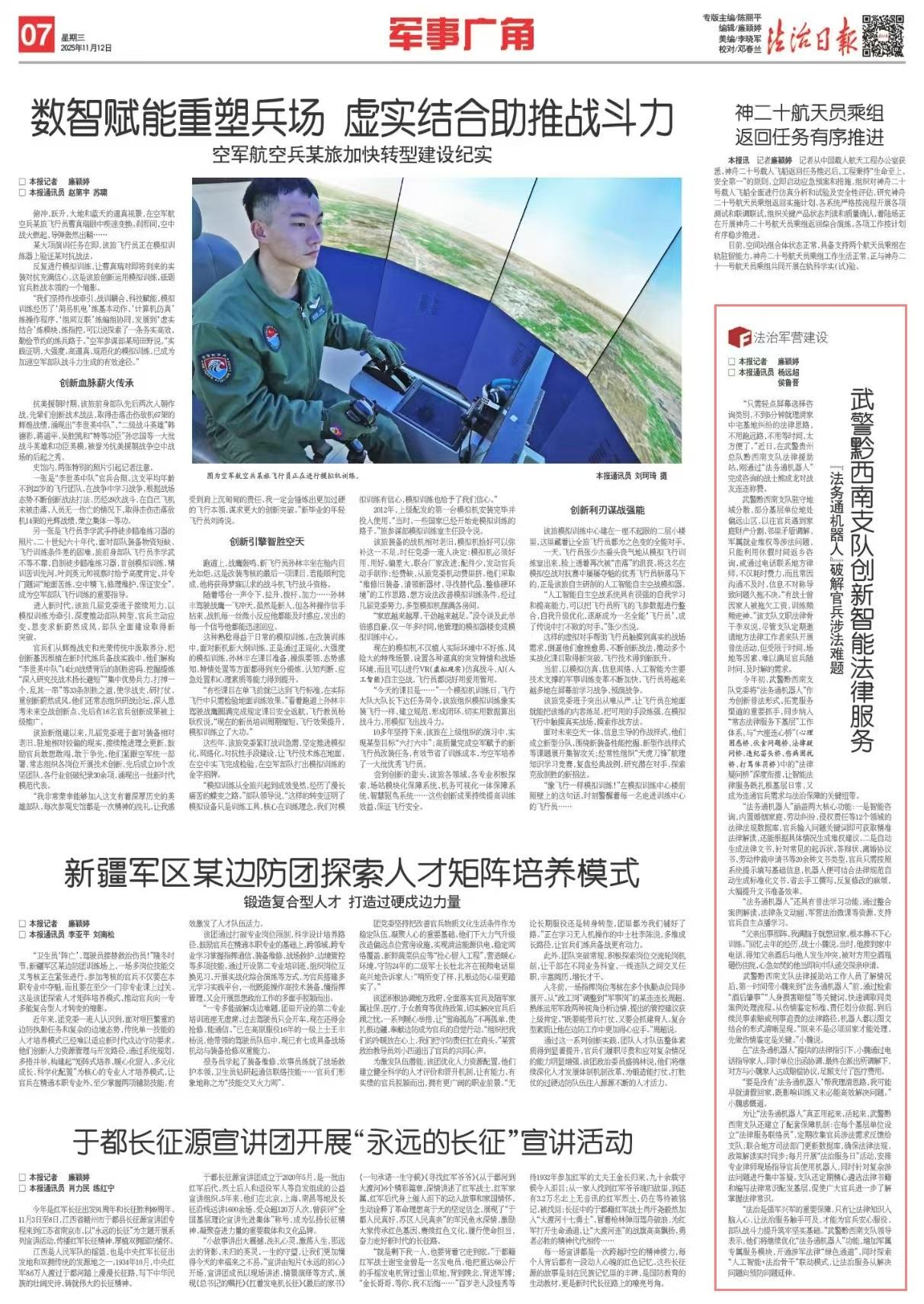 今年初,武警黔西南支隊(duì)黨委將“法務(wù)通機(jī)器人”作為創(chuàng)新普法形式、拓寬服務(wù)渠道的重要抓手,同步納入“常態(tài)法律服務(wù)下基層”工作體系,與“六座連心橋”(心理困惑橋、伙食問題橋、法律疑問橋、違紀(jì)苗頭橋、傷病困擾橋、打罵體罰橋)中的“法律疑問橋”深度銜接,讓智能法律服務(wù)既扎根基層日常,又成為連通官兵需求與法治保障的關(guān)鍵紐帶。