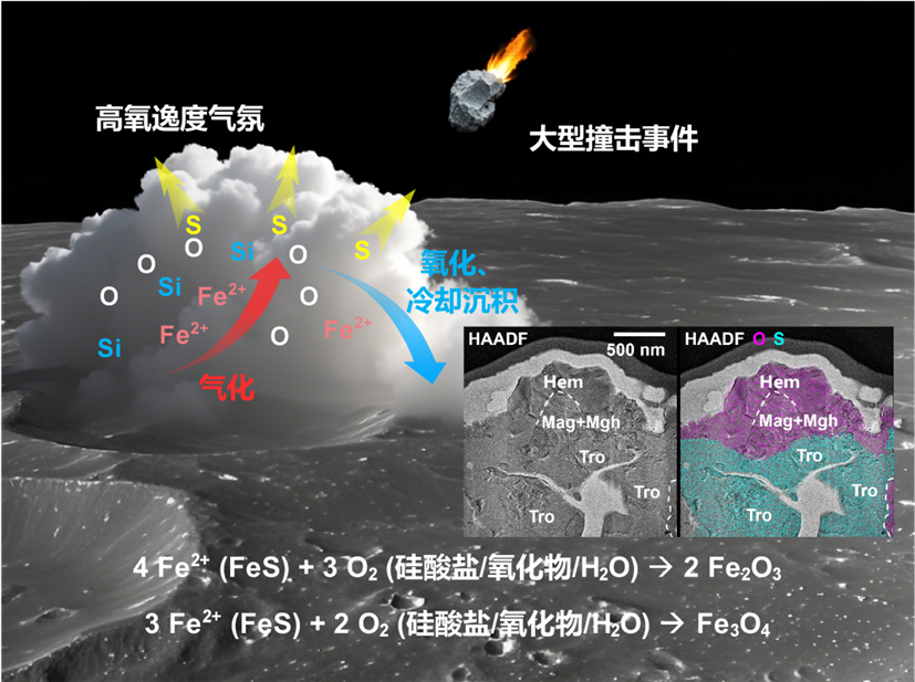自人類登月以來,月球被認(rèn)為整體還原,極度缺少氧化作用的關(guān)鍵證據(jù),特別是赤鐵礦等高價(jià)態(tài)鐵氧化物。研究提出,赤鐵礦的形成可能與月球歷史上的大型撞擊事件密切相關(guān)。大型撞擊形成瞬時(shí)高氧逸度氣相環(huán)境的同時(shí),鐵元素在高氧逸度環(huán)境中被氧化,使隕硫鐵發(fā)生了脫硫反應(yīng),經(jīng)氣相沉積過程形成微米級(jí)晶質(zhì)赤鐵礦顆粒。值得關(guān)注的是,該反應(yīng)的中間產(chǎn)物為具有磁性的磁鐵礦和磁赤鐵礦,可能是南極-艾特肯盆地邊緣磁異常的礦物載體。該研究首次利用樣品證實(shí)了在超還原背景下月球表面存在赤鐵礦等強(qiáng)氧化性物質(zhì),揭示了月球的氧化還原狀態(tài)以及磁異常成因。