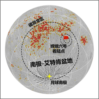圖為嫦娥六號(hào)任務(wù)著陸點(diǎn)位于月球南極-艾特肯(South Pole-Aitken,SPA)盆地東北方向的阿波羅盆地中,與SPA盆地西北部的磁異常區(qū)相鄰。本研究基于嫦娥六號(hào)樣品中鐵氧化物的發(fā)現(xiàn)提出了一種新的月球磁異常的撞擊成因假說。