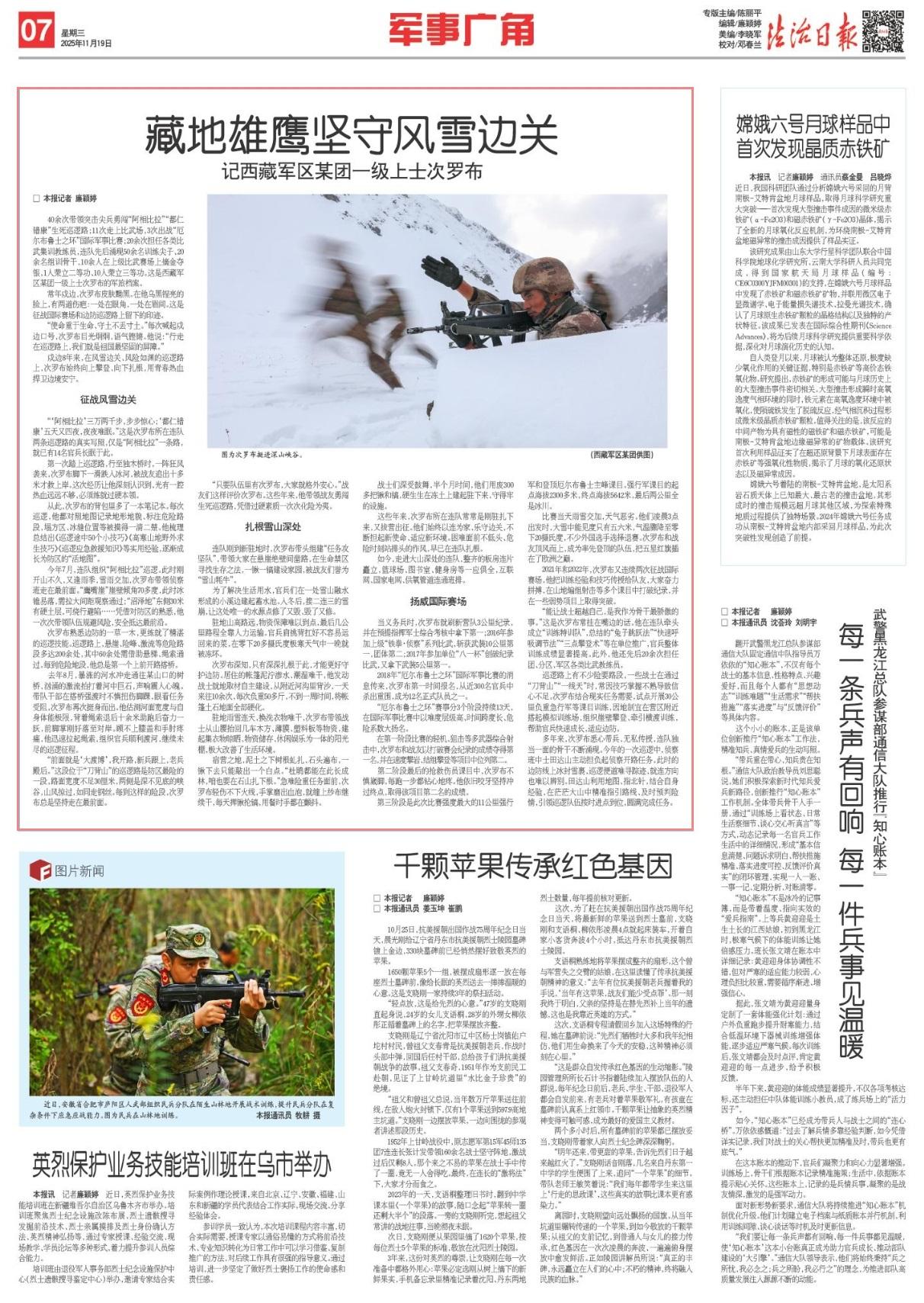 第一次踏上巡邏路,行至獨(dú)木橋時(shí),一陣狂風(fēng)襲來(lái),次羅布腳下一滑跌入冰河,被戰(zhàn)友追出十多米才救上岸。這次經(jīng)歷讓他深刻認(rèn)識(shí)到,光有一腔熱血遠(yuǎn)遠(yuǎn)不夠,必須練就過(guò)硬本領(lǐng)。