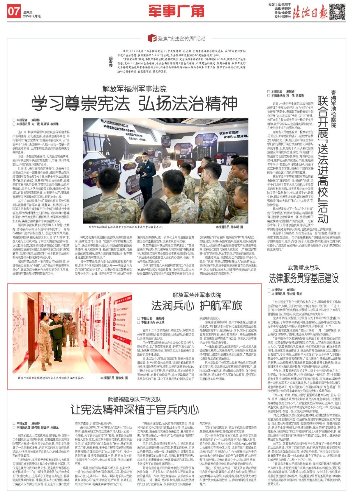 蘭州軍事法院法官結(jié)合憲法核心要義與軍人職業(yè)特點,以“尊崇憲法權(quán)威、護(hù)航軍旅生涯”為題,系統(tǒng)解讀憲法地位、發(fā)展歷史及全面依法治國取得的歷史性成就。