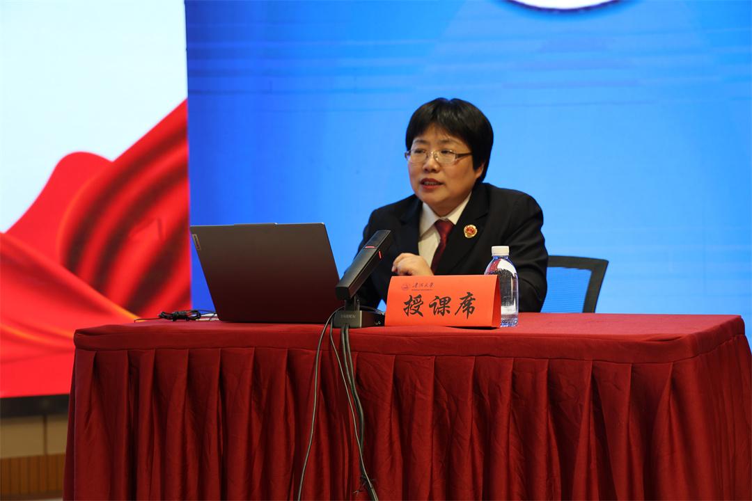 青海省人民檢察院第二檢察部主任馬玉蘭以《鑄就法治基石,成就青春夢想》為題首先開講,她以質(zhì)樸的語言為同學(xué)們系統(tǒng)講授了實行法治的歷史淵源與深刻考量,以及黨的十八大以來我國法治建設(shè)取得的歷史性成就,深刻剖析了憲法作為治國安邦總章程,對保護公民權(quán)利、維護社會秩序的基石作用。她勉勵青年學(xué)子,要主動學(xué)習(xí)憲法法律,用法律武器護航青春夢想,在法治中國的宏偉畫卷中描繪屬于自己的精彩篇章。