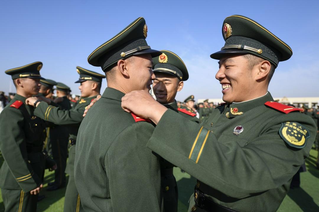 圖為新兵互相佩戴警銜。