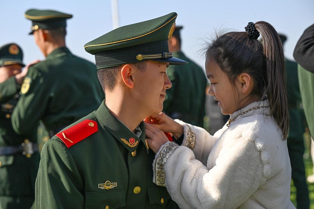 圖為一名新兵的妹妹給哥哥戴警銜。