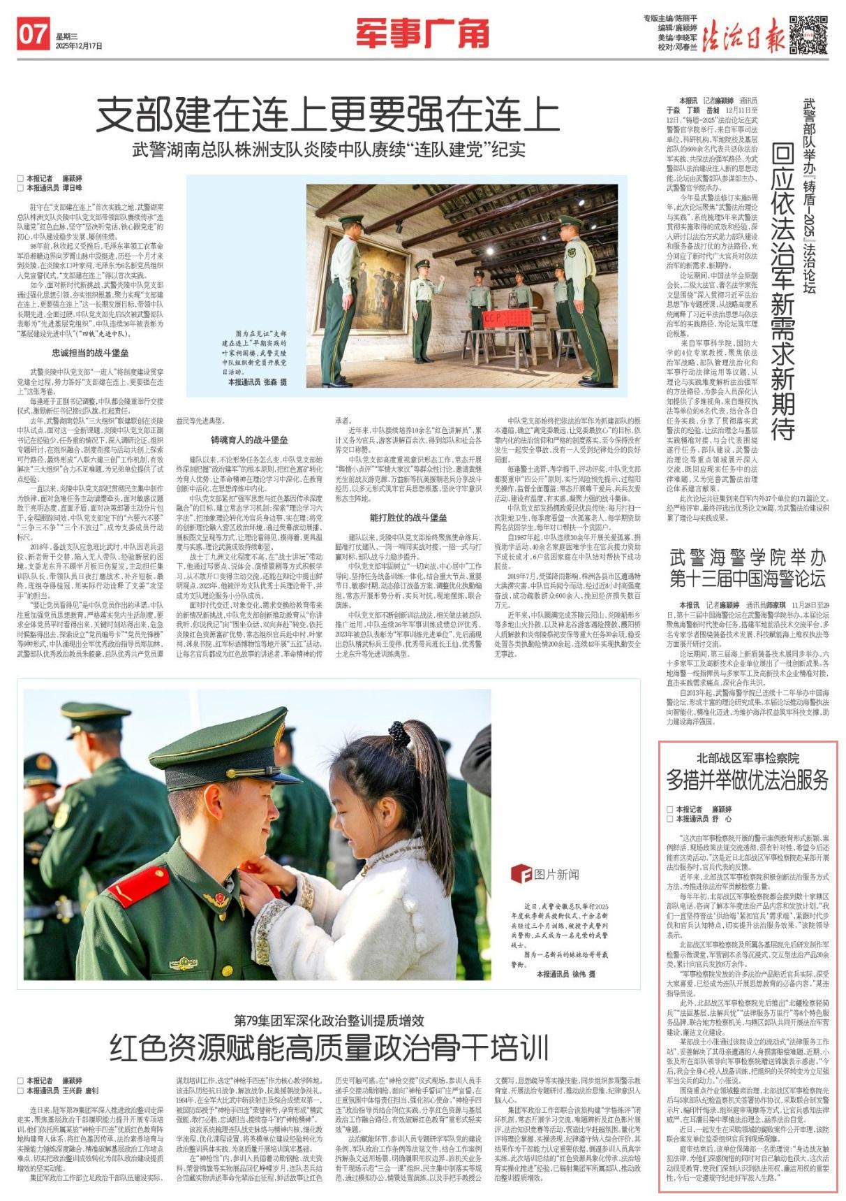 此外,北部戰(zhàn)區(qū)軍事檢察院先后推出“北疆檢察輕騎兵”“法固基層、法解兵憂”“法律服務(wù)萬(wàn)里行”等8個(gè)特色服務(wù)品牌,聯(lián)合地方檢察機(jī)關(guān),與轄區(qū)部隊(duì)共同開(kāi)展法治軍營(yíng)建設(shè)、廉潔文化建設(shè)。