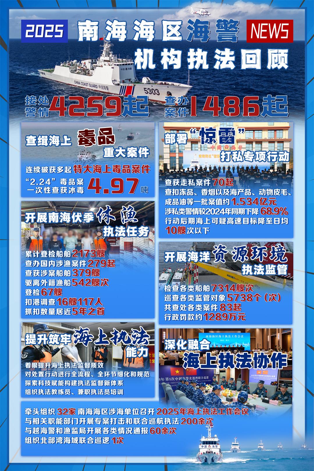 2025年,該局先后牽頭組織廣東、廣西、海南三?。▍^(qū))各級海警機構,開展“驚雷”“凈海”“碧?!薄矮B獵”、伏季休漁等各項綜合執(zhí)法任務,累計接處警情4259起,同比下降19.5%,查辦各類案件1486起,同比上升0.9%,以實際行動書寫新時代南海海區(qū)執(zhí)法工作嶄新答卷。