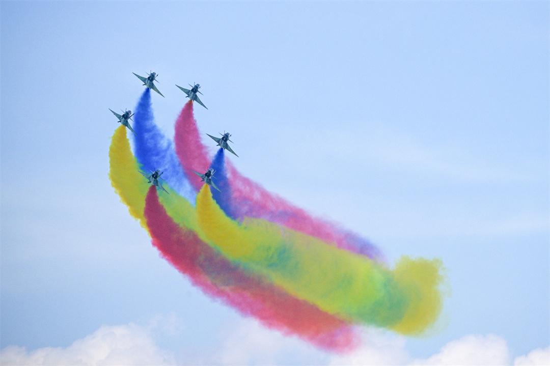 13時(shí)許,噴涂中國(guó)國(guó)旗和八一軍徽的表演機(jī)抵達(dá)樟宜展覽中心海面上空,率先編成超密集六機(jī)大箭隊(duì),在空中拉出紅、黃、藍(lán)3種顏色6道彩煙,以低空通場(chǎng)形式展現(xiàn)特殊禮儀,用“彩虹”向各國(guó)來賓致以最真摯的問候。