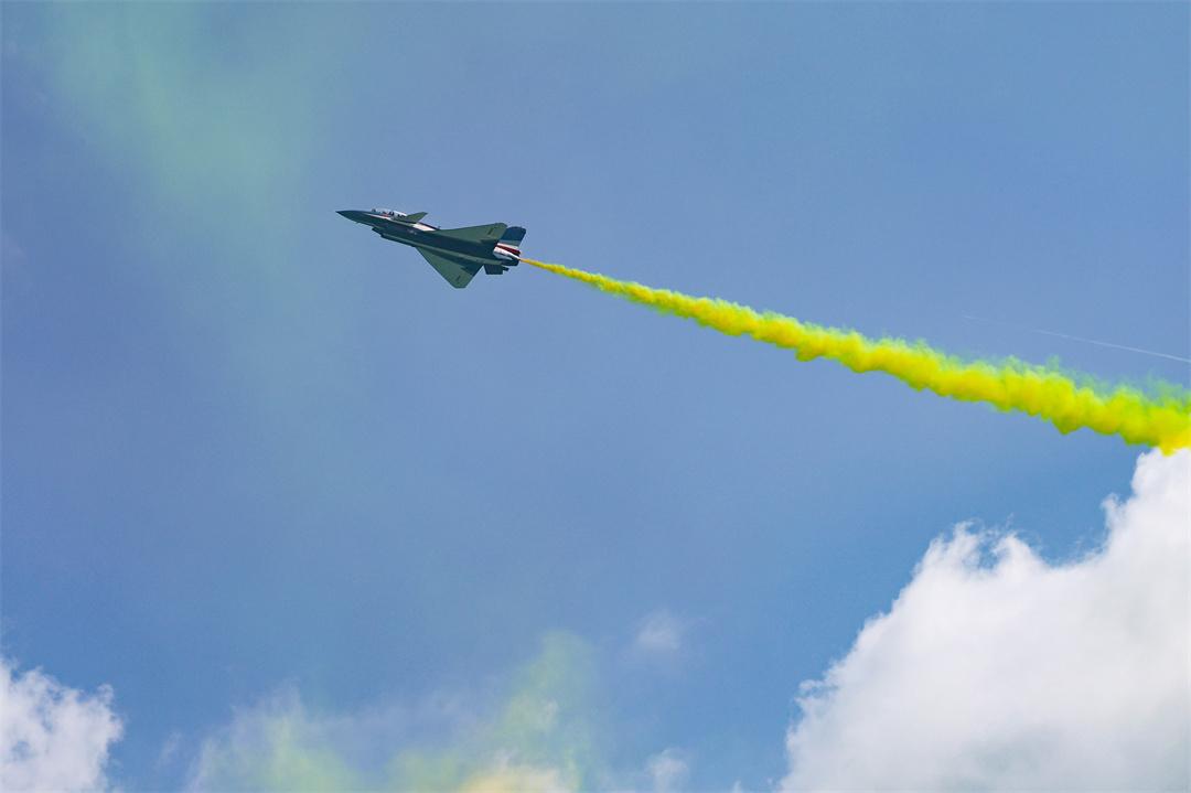 最后一個(gè)表演動(dòng)作是五機(jī)編隊(duì)在空中同步分散,彩煙勾勒出“開(kāi)花”軌跡。