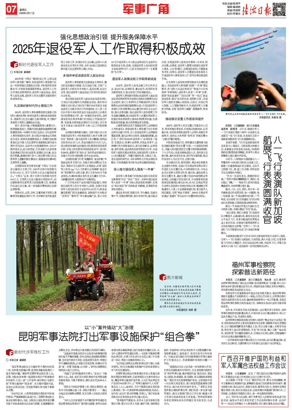 會(huì)上,憑祥市人民法院、南寧市青秀區(qū)人武部等5家單位進(jìn)行經(jīng)驗(yàn)交流,編發(fā)28個(gè)成員單位年度工作總結(jié)和《維權(quán)有我 法治護(hù)軍——自治區(qū)涉軍維權(quán)十大典型案例》,研討部隊(duì)重難點(diǎn)涉法問題。