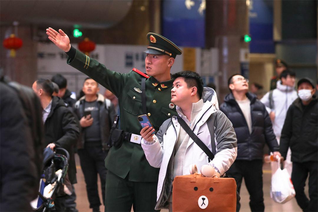 圖為執(zhí)勤武警幫助旅客尋找候車(chē)室。