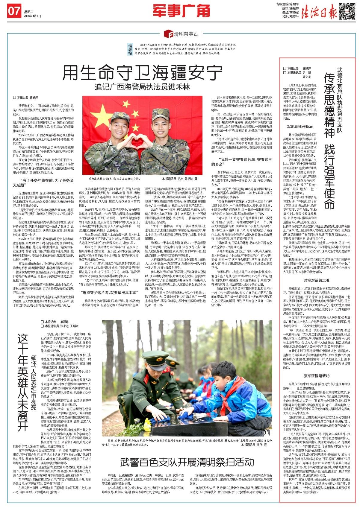3月31日上午,陜西省延安市“四八”烈士陵園內莊嚴肅穆,武警北京總隊執(zhí)勤第五支隊官兵代表整齊列隊,與千里之外北京營區(qū)的張思德中隊官兵通過視頻連線,同步舉行清明祭奠儀式。英雄精神在兩地官兵心中同頻共振。