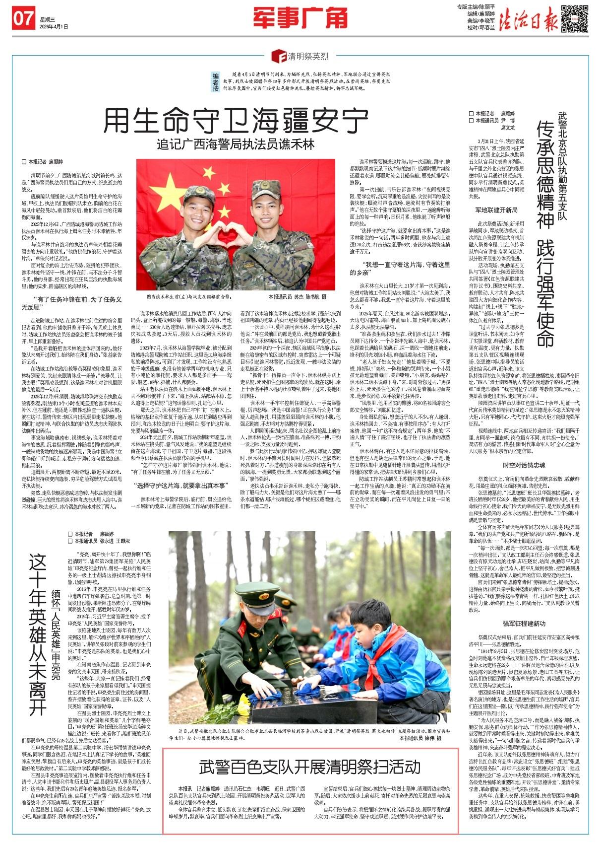 近日,武警廣西總隊(duì)百色支隊(duì)官兵來(lái)到烈士陵園,開(kāi)展清明祭掃英烈活動(dòng),以軍人的崇高禮儀緬懷革命先烈。