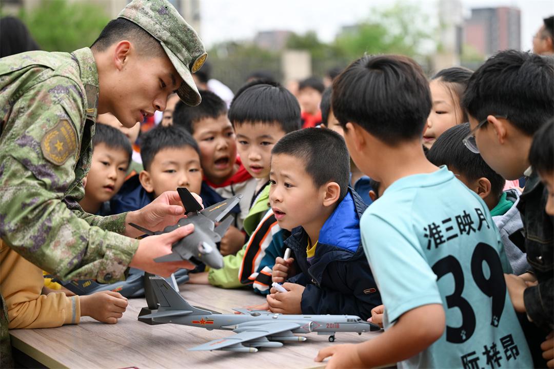 圖為官兵向小學(xué)生介紹裝備模型。